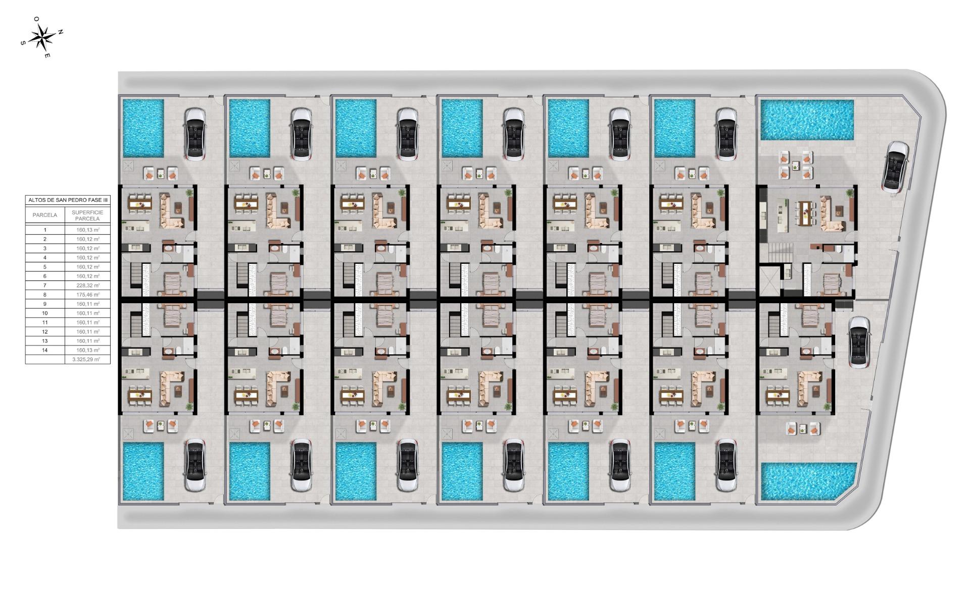 Modern New Build Villas with Private Pool in San Pedro del Pinatar Contemporary Design and Premium Quality Living Discover the third phase of this exclusive residential project in San Pedro del Pinatar, where modern architecture meets comfort and functionality. These 14 semi detached villas are designed with a minimalist style and high quality finishes, offering an elegant and sophisticated living experience on the Costa Calida. Each villa features 3-4 spacious bedrooms, 3 bathrooms, private swimming pool, terraces and a private garden, creating the perfect environment for privacy, relaxation and Mediterranean outdoor living. San Pedro del Pinatar is one of the most sought after towns in the Mar Menor area, known for its natural salt lakes, calm beaches and year round pleasant climate, making it ideal for both permanent living and holiday use. Open Plan Layout Designed for Modern Life The villas are carefully distributed with an open plan kitchen connected to a bright living and dining area. Large windows in the living room with motorized blinds provide direct access to the pool area and allow natural light to flood the interior spaces. Key features of each property include: 3 bedrooms with built in wardrobes 3 fully equipped bathrooms with vanity units, mirrors and shower screens Furnished kitchen with Balay appliances included Private pool and garden area Interior and exterior LED lighting Terraces on the first floor and optional rooftop solarium On plot parking space Aerothermal system for hot water Photovoltaic solar panels for improved energy efficiency Pre installation of ducted air conditioning These homes are designed to combine sustainability, comfort and modern style in every detail. Prime Location Near Beaches and Services Located between the Mar Menor and the Mediterranean Sea, San Pedro del Pinatar is a paradise for beach lovers and water sports enthusiasts. The town offers a lively marina, natural mud baths, shops, restaurants, sports facilities and excellent services all year round. Beaches of the Mar Menor 3 km Mediterranean beaches 5 km Dos Mares Shopping Center 5 km Lo Romero Golf 10 km Roda Golf 15 km Murcia Corvera Airport 30 km Alicante Airport 80 km San Pedro Marina 4 km An Ideal Home for Lifestyle and Investment Thanks to their location, design and energy efficient features, these villas represent an excellent opportunity as a permanent residence, holiday home or rental investment in one of the most attractive areas of the Costa Calida. Contact us today for more information or to arrange a viewing and secure your new villa in San Pedro del Pinatar. 1103
