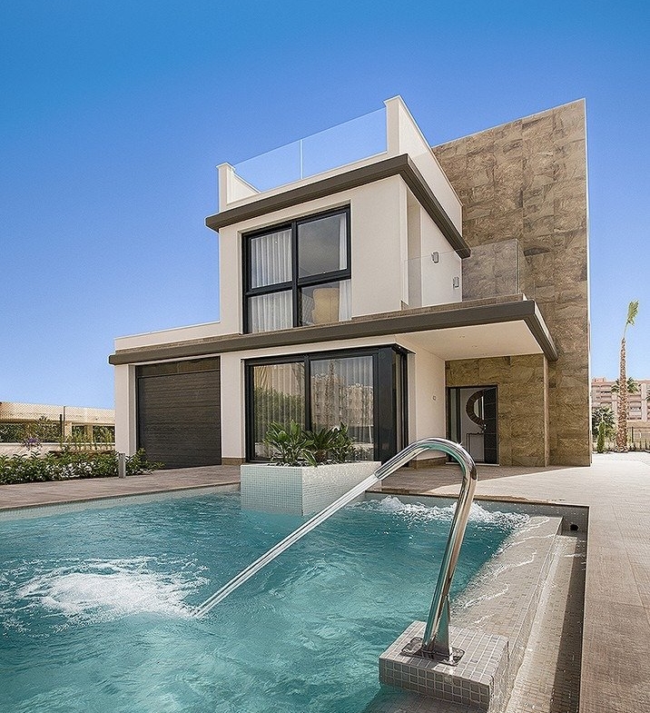 NEW BUILD VILLA IN PLAYA HONDA Villa with basement, garage, private pool and solarium, fully finished and ready to move into. Located on a plot of more than 400 m2 and 1 km from the Mar Menor beach in Playa Honda, with all services around. Close to the famous La Manga golf course and the Calblanque natural park. 1103